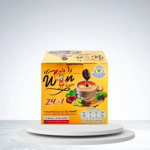 กาแฟสุขภาพ ไร้น้ำตาล เบต้ากลูแคนจากข้าว, โกจิเบอร์รี่, ไลม์เทกซ์, เห็ดหลินจือ, ใบแปะก๊วย, กระเจี๊ยบ, สตรอว์เบอร์รี่ และสมุนไพรรวมกว่า 24 ชนิด